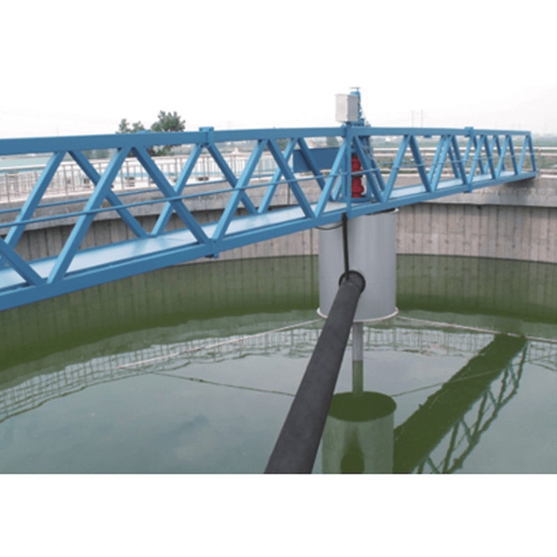 懸掛式中心傳動(dòng)刮泥機(jī)主要由減速驅(qū)動(dòng)機(jī)構(gòu)、中心傳動(dòng)裝置、刮泥系統(tǒng)、水下軸承及集泥槽等部件組成,整臺(tái)刮泥機(jī)的荷載都作用在固定橫跨池徑的工作橋上。適用于給排水過程中水廠或污水處理廠直徑一般不大于20m的輻流式(圓形)沉淀池的污泥刮集和排除。